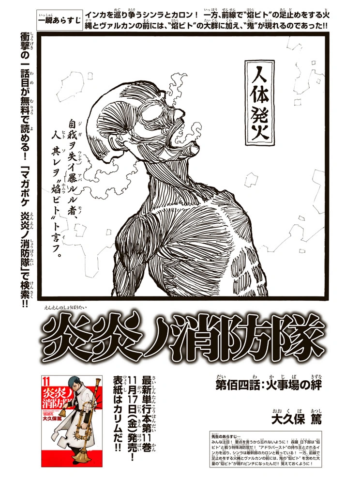 Bonds of the Fireground (火事場の絆, Kajiba no Kizuna) is the one hundredth and fourth chapter of the Fire Force manga series.