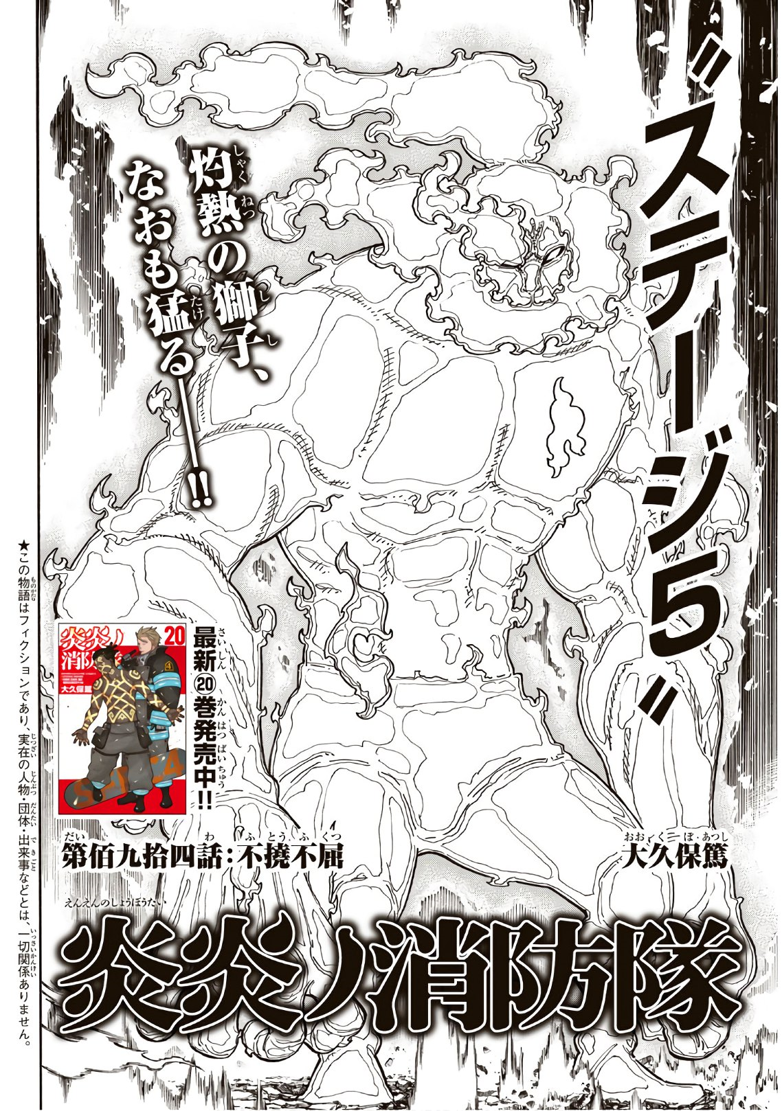Indomitable (不撓不屈, Futō Fukutsu) is the one hundredth and ninety fourth chapter of the Fire Force manga series.