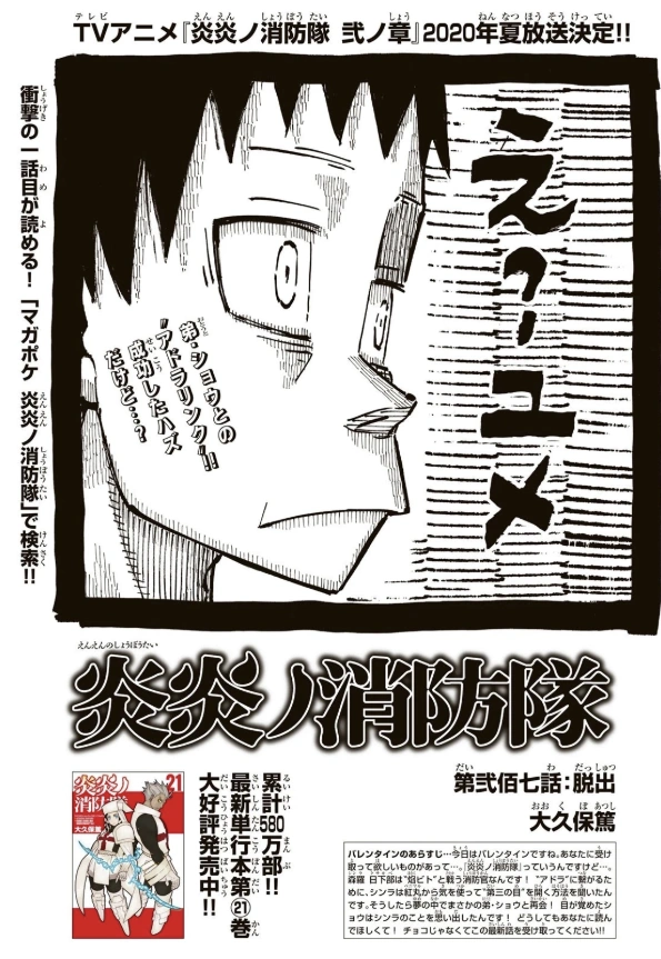 Escape (脱出, Dasshutsu) is the two hundredth and seventh chapter of the Fire Force manga series.