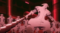 As Benimaru Shinmon and Joker explore the underground passages beneath the Holy See, a minimum of eight Shadows approach them from the darkness with their hands in the reverse prayer gesture. The majority of the group battle against Benimaru while the Shadow Captain battles against Joker. Despite their endurance and skill, the Shadows are ultimately beaten by the Captain of Company 7. The captain battles against Joker and is able to overpower him until the criminal's illusions leave him vulnerable. Distracted and separated from the group, the Captain is quickly killed by Joker. With only one death, Leonardo Burns is able to force the Holy Sol to deal with the matter internally and allow Joker and Benimaru to leave peacefully.
