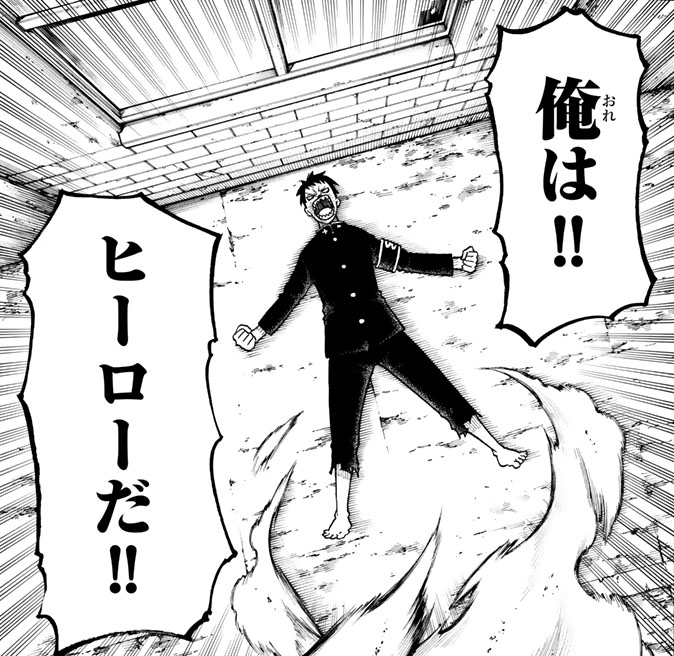 Arthur manages to sense Amaterasu's control over Shinra but is unable to break their connection. Shinra actives his Rapid and blows Arthur and Ogun away. Arthur and the Company 4 members move to restrain Shinra's movements. This causes Arthur to imagine that they are on a fantasy quest to slay a demon, increasing his focus and hyper-awareness and allows him to dodge Shinra's attacks. Although it results in him using Sōichirō as a human shield. After pushing Shinra back, Arthur asks why Shinra is not talking about his heroic ideals. To which Shinra responds that heroes will burn, although Arthur questions if it is actually Amaterasu speaking through him. Meanwhile, in Shinra's Adolla hallucination, Hitohashira Me pushes him to murder the Kingly Knight. In exchange she promises to bring Shinra to his mother.